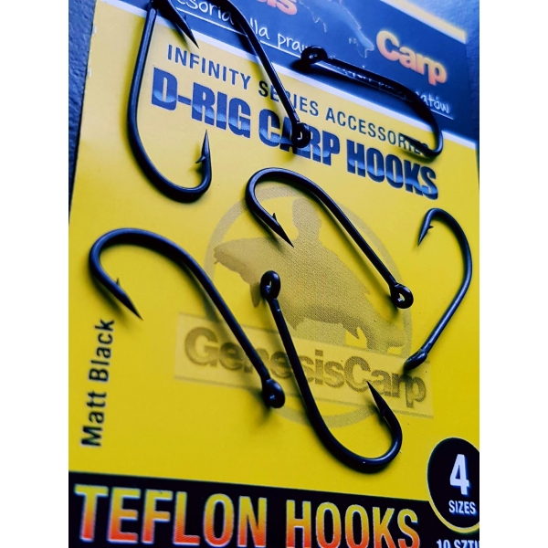 Haczyki karpiowe Genesis sa specjalnie zaprojektowane, aby spełniały wymagania wędkarzy nad wodą. Dzięki temu haczyki sprawdzają się w każdej sytuacji nad wodą, pokryte cienką warstwą teflonu, który minimalizuje refleksy świetlne, co zwiększa skuteczność łowienia. Haczyk idealny do przyponu typu D-RIG.