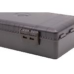 Pokrywa posiada linijkę umożliwiającą dokładne zmierzenie przyponów i jest zapinana na dwa zatrzaski, aby zapobiec otwarciu się podczas transportu. Wewnątrz pokrywy pudełka BASIX Tackle Box znajduje się 21 małych, zamykanych na zatrzask przegródek o różnych rozmiarach, które idealnie nadają się do przechowywania takich przedmiotów, jak klipsy do ciężarków i krętliki. Wewnątrz pudełka znajdują się dwie duże przegródki ze stałymi przegródkami, które idealnie nadają się na narzędzia do przyponów, szpule z przyponami i tym podobne.