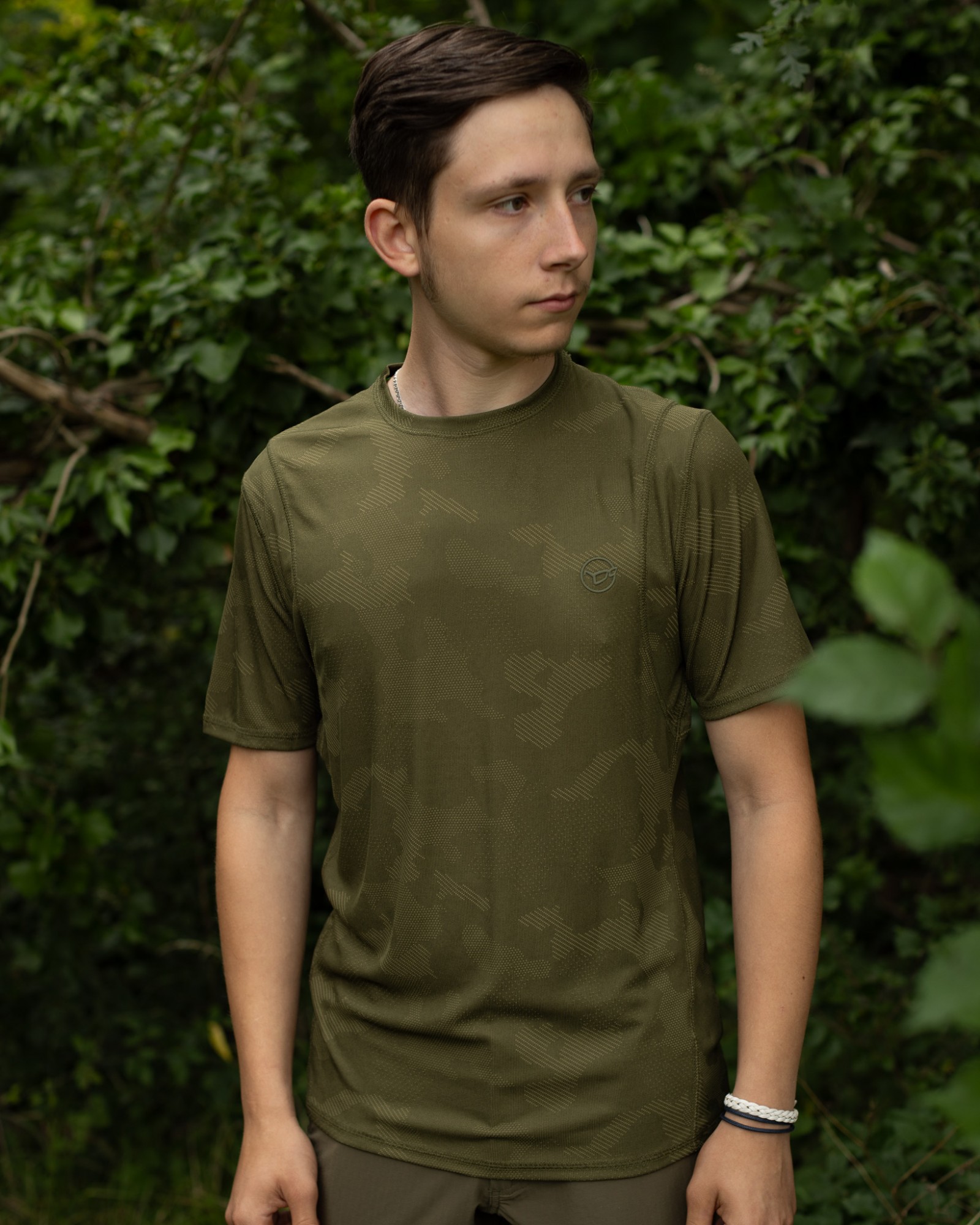 Dopasowany, anatomiczny krój delikatnie podkreśla sylwetkę, jednocześnie nie ograniczając swobody ruchów. Materiał gwarantuje doskonałą cyrkulację powietrza, co zwiększa przewiewność i zapobiega przegrzewaniu organizmu. Subtelny, jasnooliwkowy wzór kamo nadaje koszulce nowoczesny, outdoorowy charakter, idealnie wpisujący się w styl odzieży wędkarskiej i sportowej.