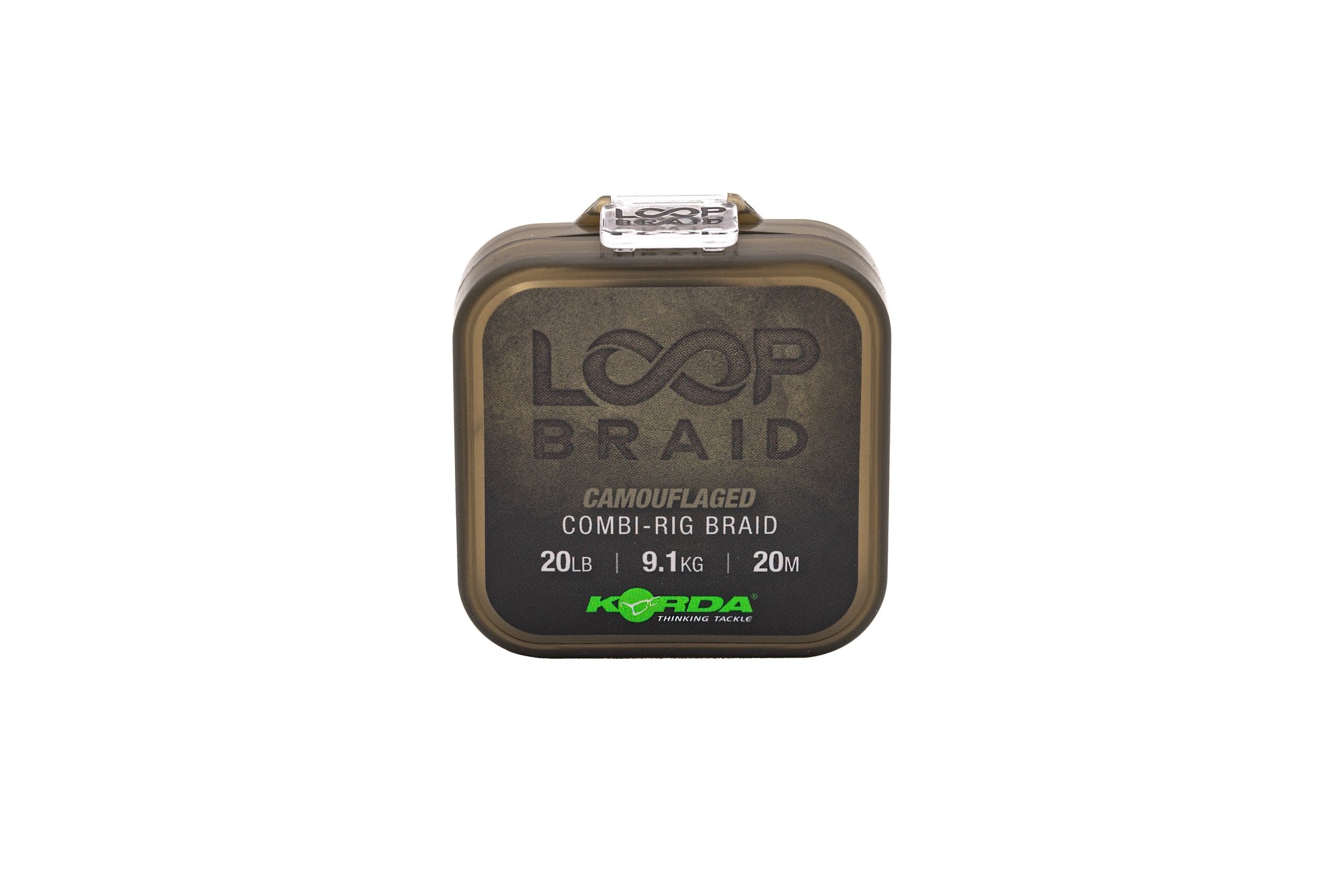Loop Braid ma kamuflujący kolor, wytrzymałość 20 lb oraz długość 20 m. Nawinięta jest na kwadratową szpulę, idealnie pasującą do systemu Korda Tackle Box.