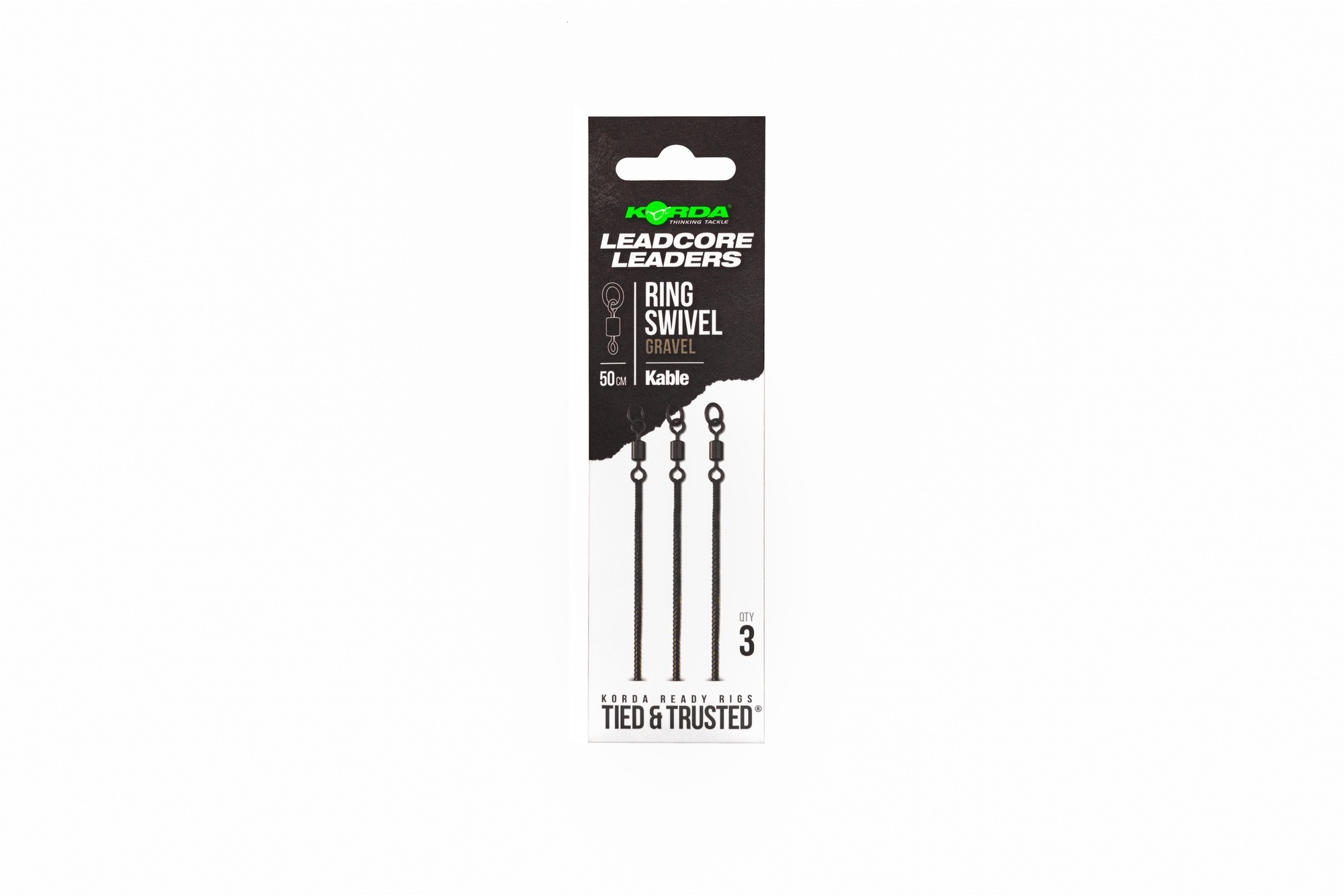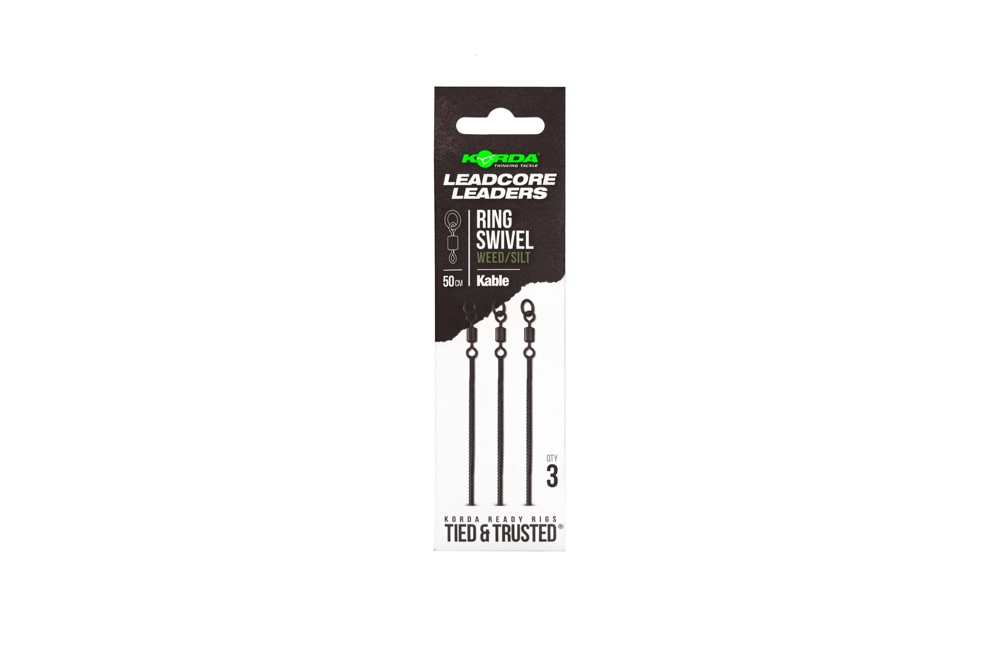 Każde opakowanie zawiera trzy leadery Kable Ring Swivel, dostępne w kolorach Weed/Silt lub Gravel Brown.