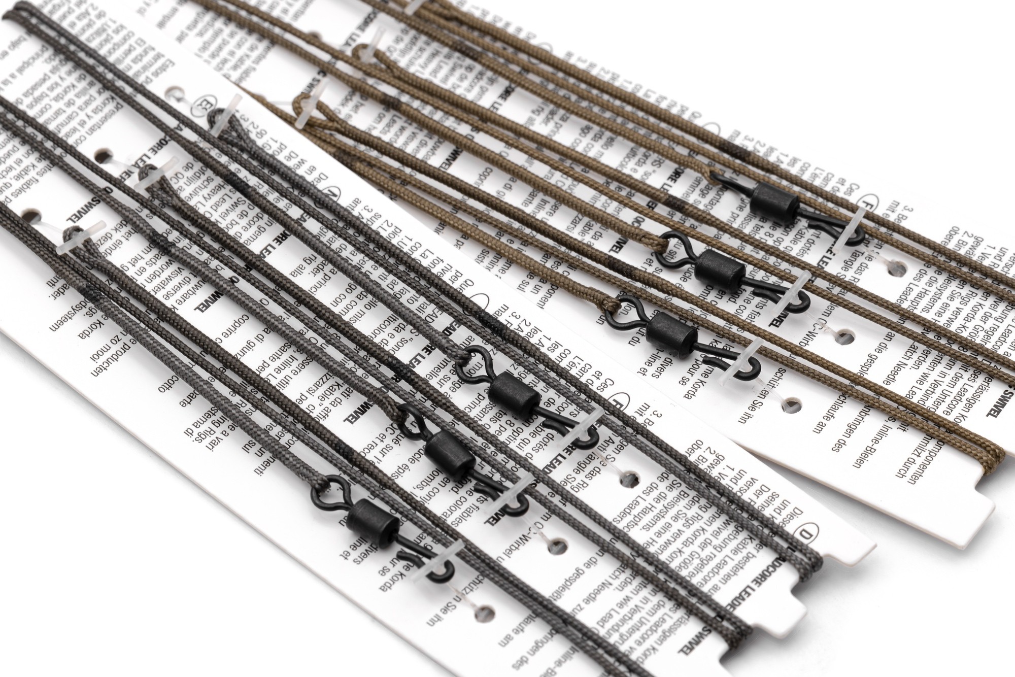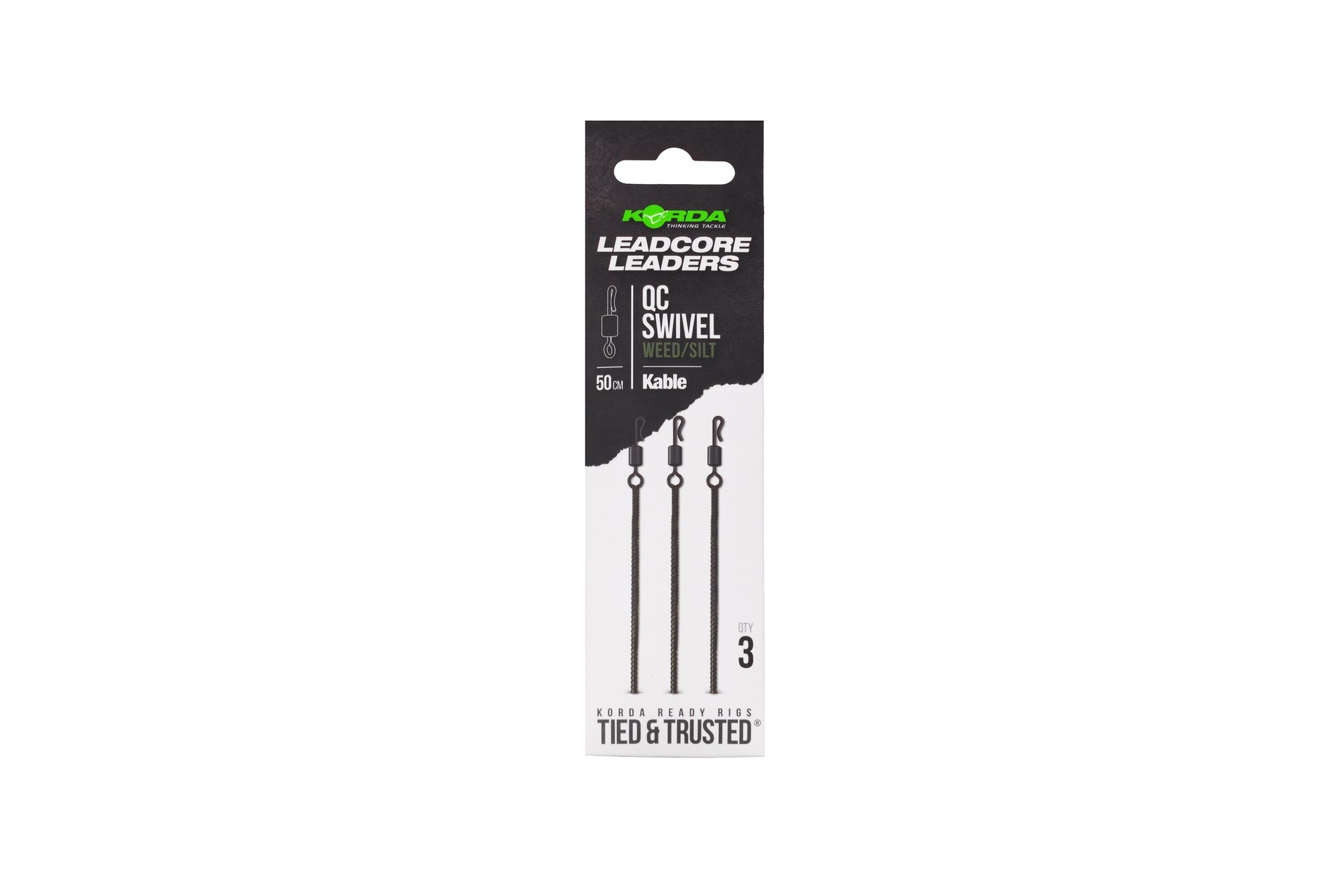Każde opakowanie zawiera trzy leadery QC Ring Swivel, dostępne w kolorach Weed Green lub Gravel Brown.
