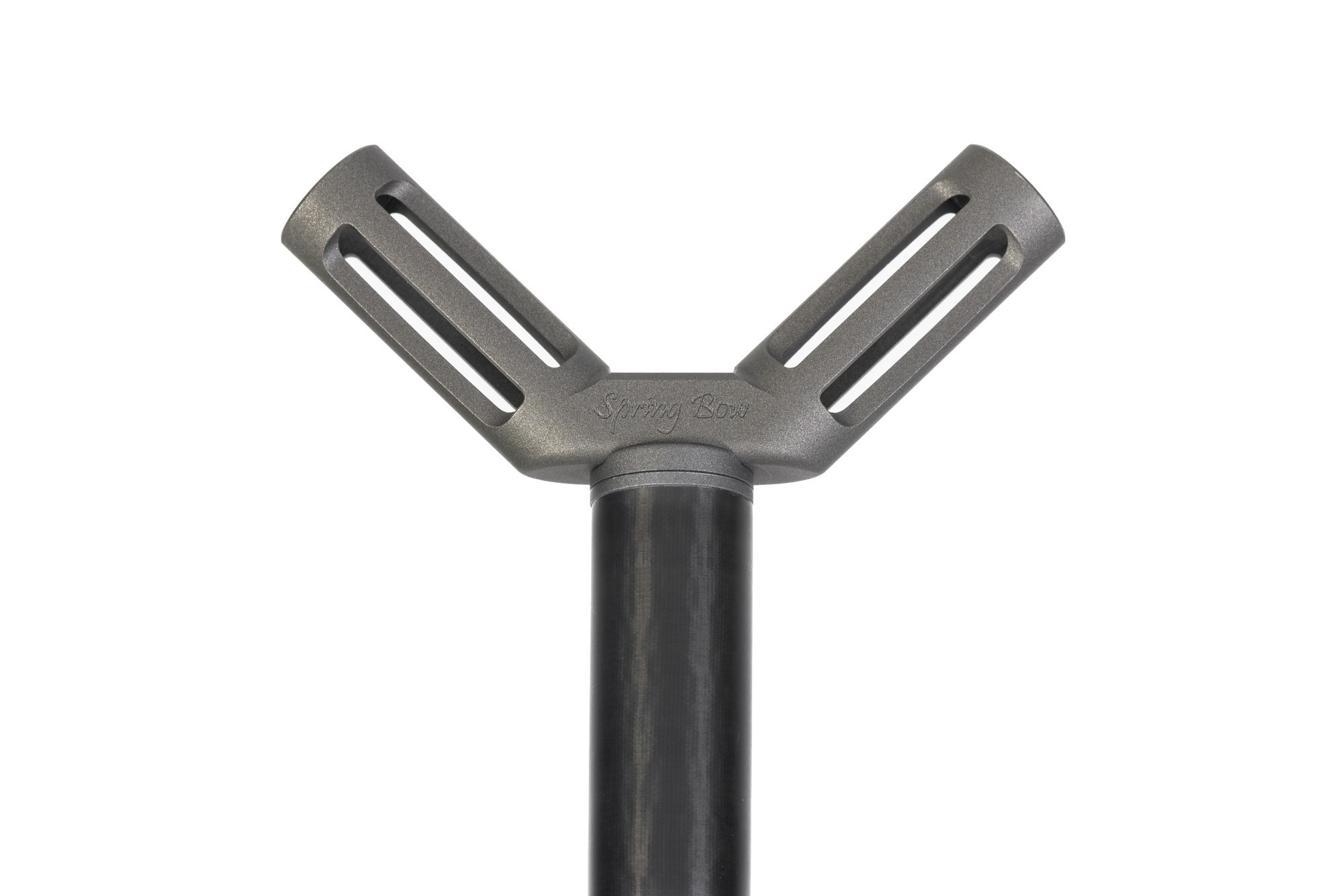 Aluminiowy blok rozpierający jest frezowany zarówno z przodu, jak i z tyłu, co dodatkowo redukuje wagę i nadaje mu „szkieletowy” wygląd. Z przodu znajduje się slot na izotop 15 mm (brak w zestawie), a z tyłu wygrawerowane logo Spring Bow. Całość wykończona jest trwałą, ceramiczną powłoką w kolorze Gun Smoke.
