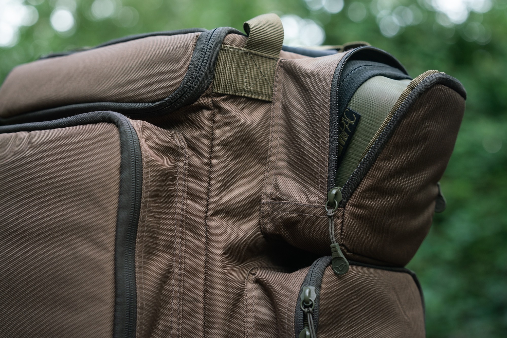 Plecak ma pojemność 45 litrów i oferuje bardzo dobre możliwości organizacji. Cztery boczne kieszenie zewnętrzne są dopasowane do pokrowców Compac EVA 100 lub 110, co ułatwia segregację drobnych akcesoriów. Z przodu znajduje się kieszeń, do której idealnie pasuje Korda Tackle Box, zapewniając szybki dostęp do najważniejszego terminal tackle.