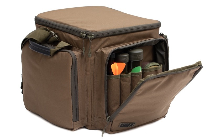 Torba Compac Cube Carryall została stworzona z myślą o wędkarzach wybierających się na krótsze zasiadki, którzy nie zabierają ze sobą dużej ilości sprzętu, a także jako praktyczny element organizacji wyposażenia podczas dłuższych wypraw — w połączeniu z innymi produktami z serii Compac. Konstrukcja opiera się na centralnej, sześciennej komorze o wymiarach 12 cali z każdej strony i pojemności 30 litrów, w której można przechowywać większe akcesoria. Wewnątrz znajduje się także kieszeń mieszcząca mały tablet w etui oraz zapinana na zamek kieszeń umieszczona od spodu pokrywy.
