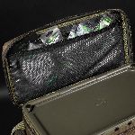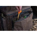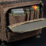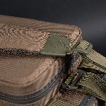 Na zewnątrz torba posiada pięć kieszeni, z czego cztery są idealnie dopasowane do pokrowców Compac EVA w rozmiarach 100, 110, 125 oraz 140. Przednia kieszeń jest na tyle duża, że mieści Korda Tackle Box, co pozwala zaoszczędzić miejsce w komorze głównej i poprawia organizację sprzętu. Kieszeń przednia ma również dwa wewnętrzne organizery, które można skonfigurować według własnych potrzeb. Boczne kieszenie wyposażono w formowane przelotki do kabli, co ułatwia dostęp np. do przewodów ładowania.