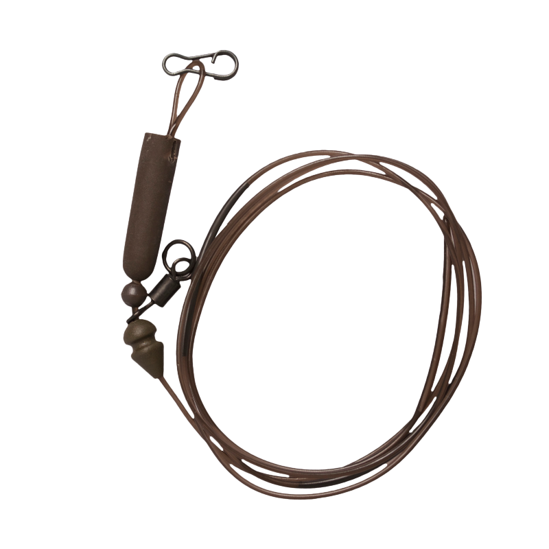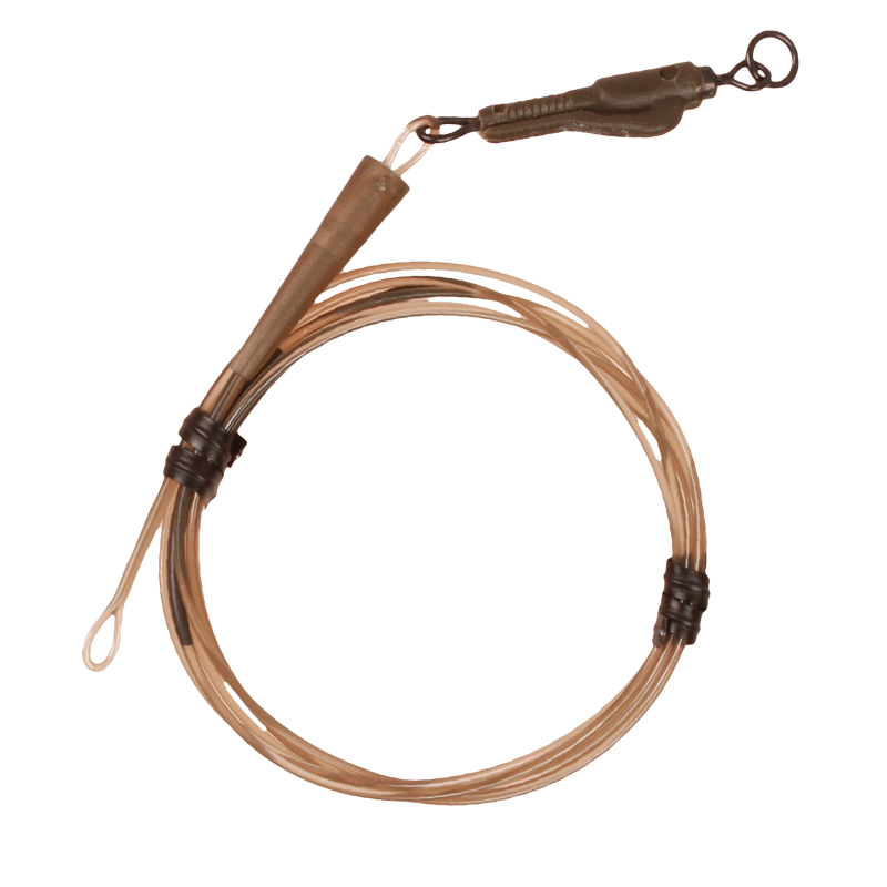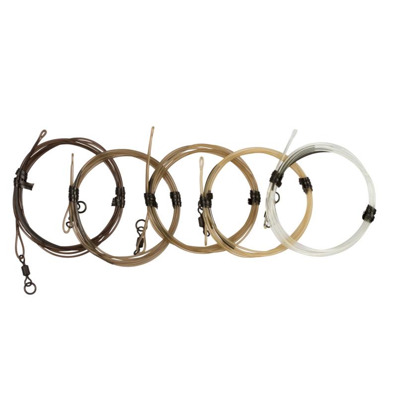 Przypony Dark Matter są praktycznie niezniszczalne. Rdzeń z wytrzymałej żyłki monofilamentowej w połączeniu z poliuretanową powłoką zapewnia im bardzo wysoką odporność na przetarcia. Pod wodą pozostają niemal niewidoczne, zgodnie z zasadą „Safe Zone” — im mniej widoczny jest zestaw końcowy, tym większa szansa na brania. Wbudowane sekcje z wolframu dociążają przypon i pomagają utrzymać go przy dnie. Seria dostępna jest w trzech wariantach: z krętlikiem typu ring swivel w rozmiarze 8, w wersji Hybrid Lead Clip oraz w konfiguracji Heli/Chod.