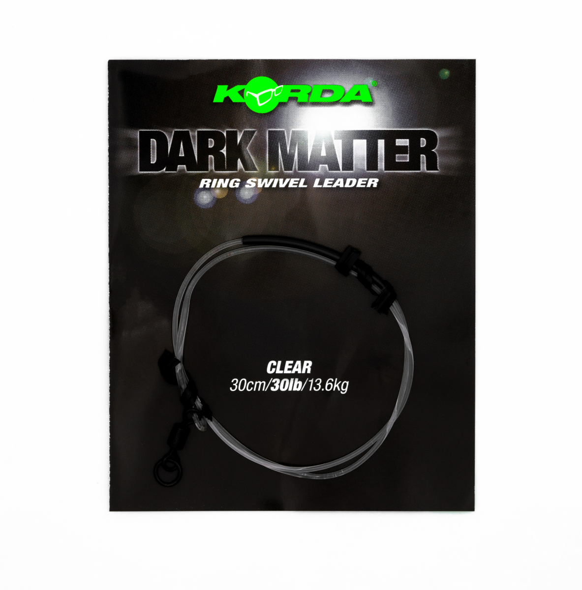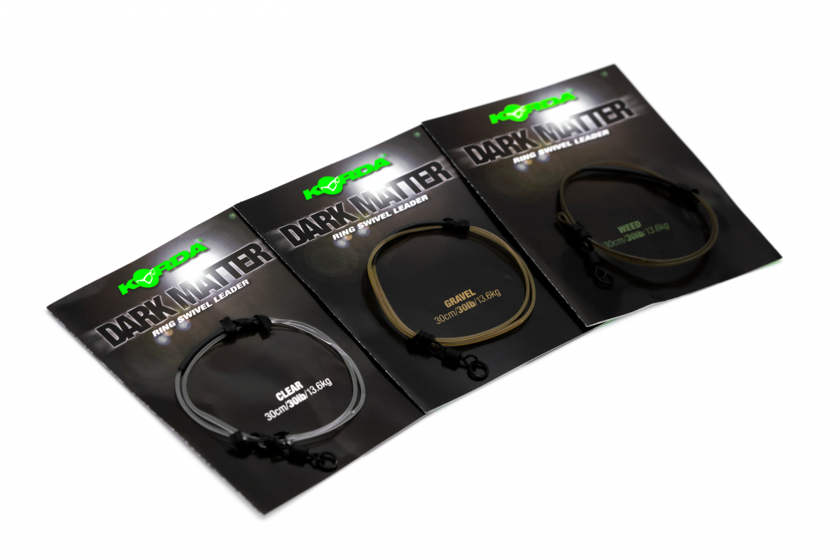 Korda Dark Matter Ring Swivel Leader w kolorze Weed, o wytrzymałości 30 lb i długości 30 cm, wykonany jest z materiału z wtopionymi odcinkami wolframu. Dzięki temu leader stabilnie przylega do dna i pomaga zminimalizować ryzyko spłoszenia ryb. Na jednym końcu znajduje się krętlik z kółkiem w rozmiarze 8, trwale połączony z linką, a drugi koniec zakończony jest zgrzewaną pętlą do szybkiego łączenia i odłączania od żyłki głównej — najwygodniej zrobić to systemem pętla-w-pętlę.