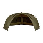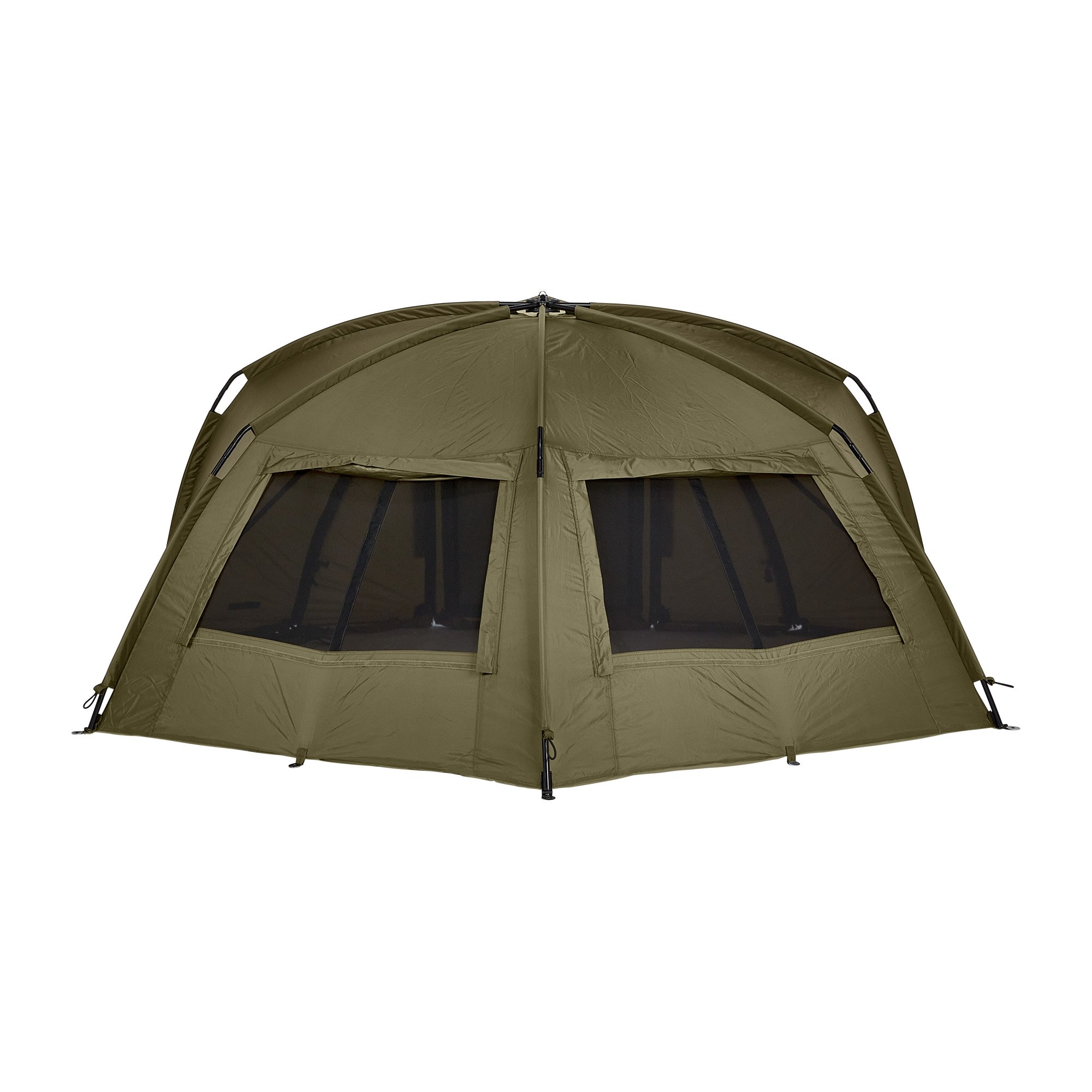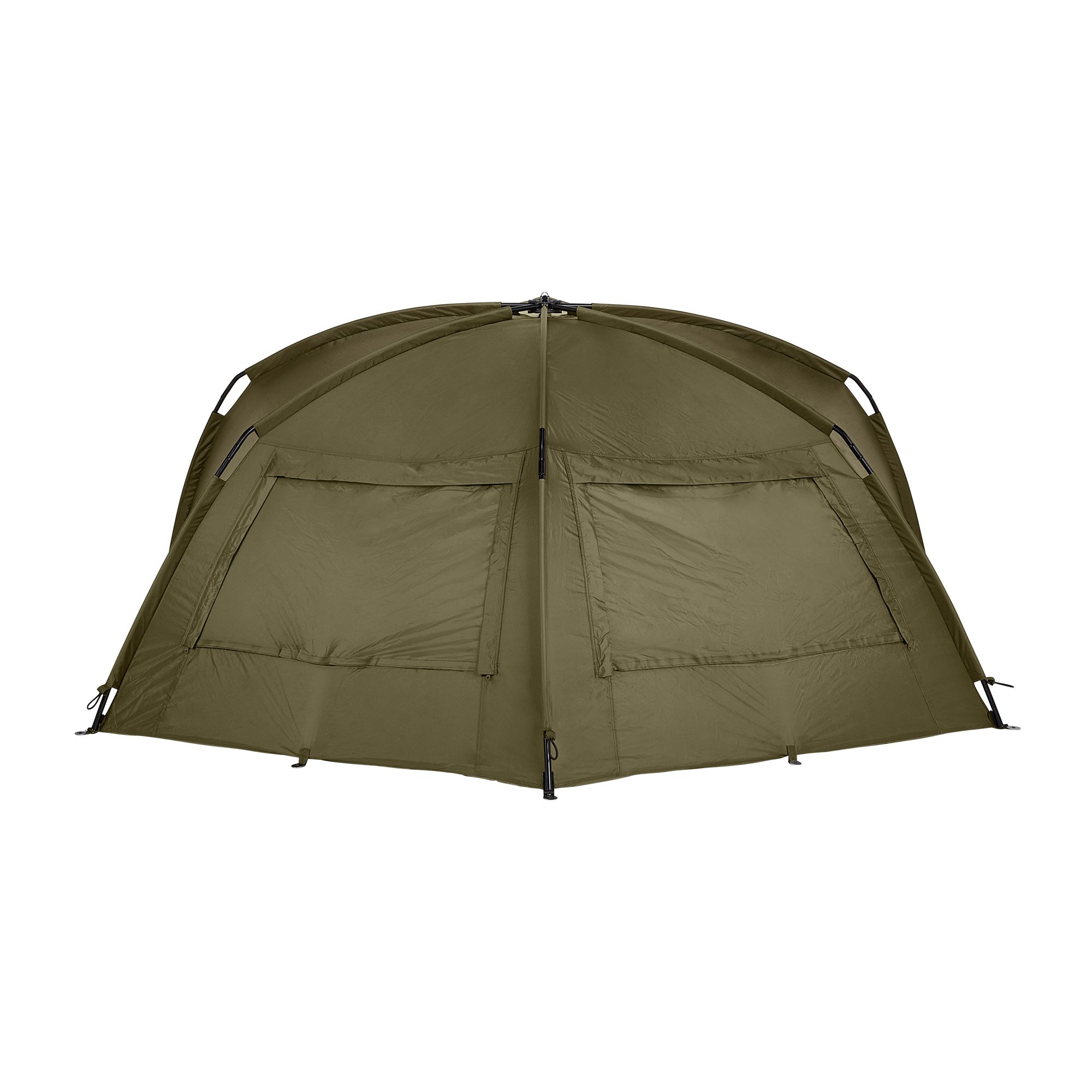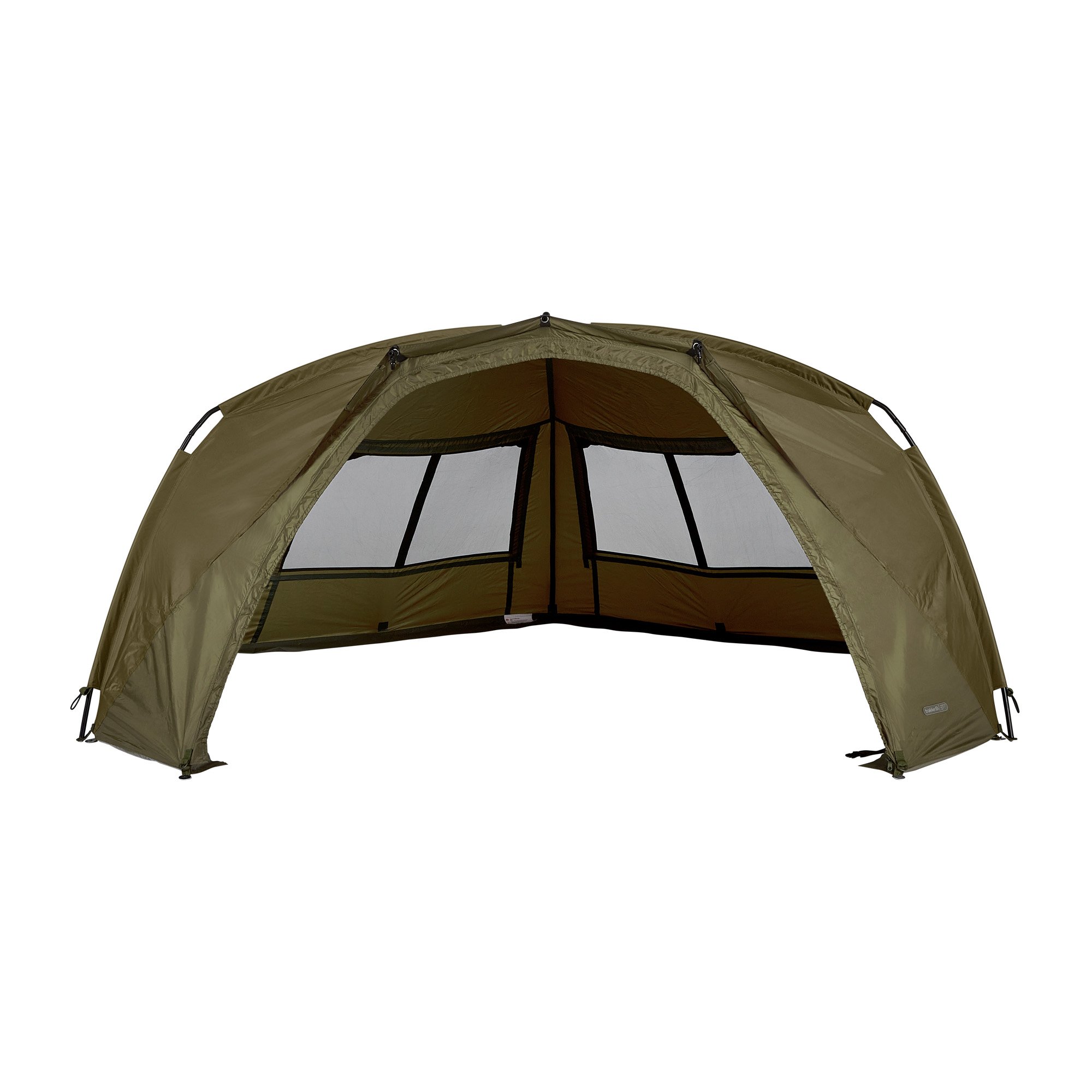 W środku znajduje się przestrzeń idealna pod jedno łóżko karpiowe z odpowiednią ilością miejsca na dodatkowy sprzęt. Praktyczne paski na wędki (dual rod straps) umożliwiają stabilne podpięcie kijów, a system anti-twist poles ułatwia rozstawianie i poprawia stabilność konstrukcji.