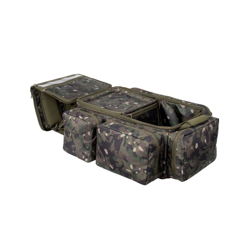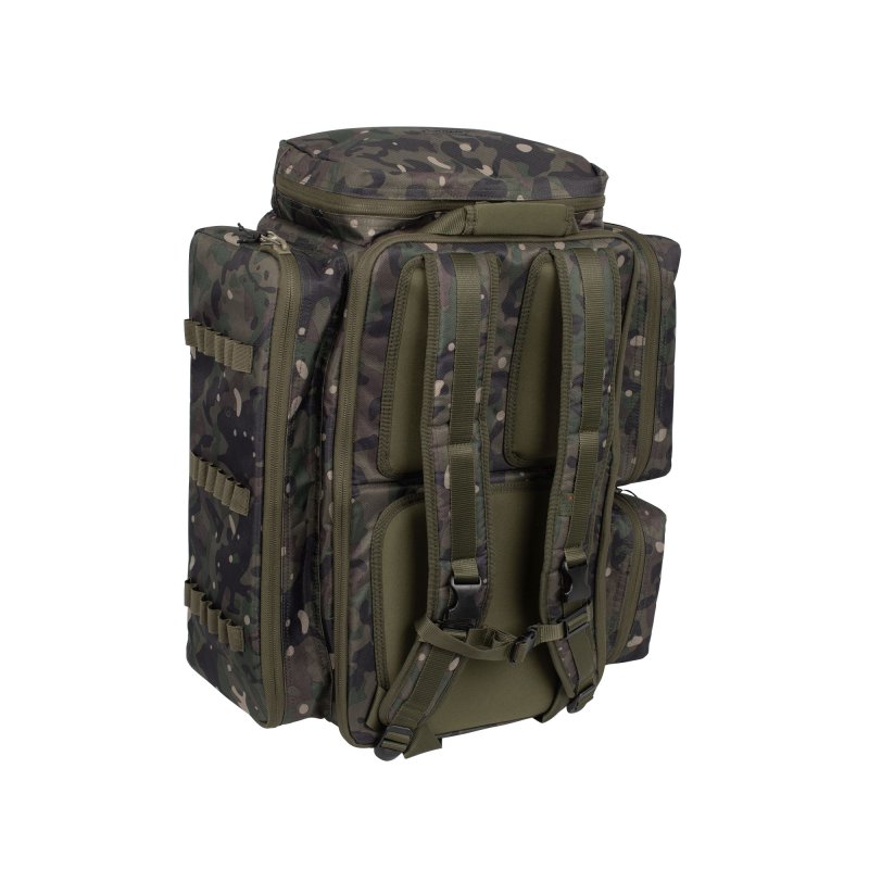 NXC Deluxe Rucksack może pełnić rolę pełnoprawnej stacji roboczej. Stolik EVA można mocować w kilku pozycjach lub całkowicie odpiąć i używać samodzielnie jako stołu do wiązania zestawów. Dwie siatkowe kieszenie zapinane na zamek pozwalają mieć najważniejsze akcesoria zawsze pod ręką. Komora główna oferuje dużą przestrzeń ładunkową oraz dodatkową kieszeń zapinaną na zamek. Długa zewnętrzna kieszeń boczna posiada wyściełaną przegrodę do bezpiecznego transportu sygnalizatorów i buzz barów, a na zewnątrz umieszczono elastyczne uchwyty na banksticki w różnych rozmiarach. Do dyspozycji są również trzy duże kieszenie zewnętrzne na niezbędny sprzęt. Całość jest solidnie wyściełana, aby zapewnić maksymalną ochronę zawartości.