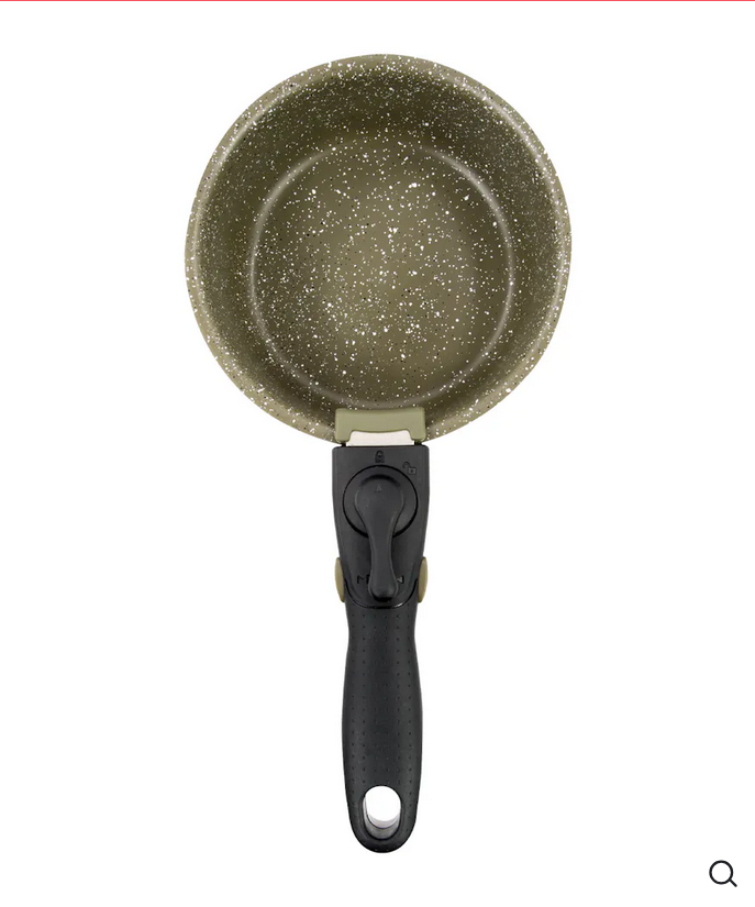Każdy zestaw zawiera rondel, patelnię i odczepiany uchwyt kompatybilny ze wszystkimi patelniami z serii, z podwójnym zabezpieczeniem zapobiegającym przypadkowemu odłączeniu podczas przenoszenia gorących naczyń