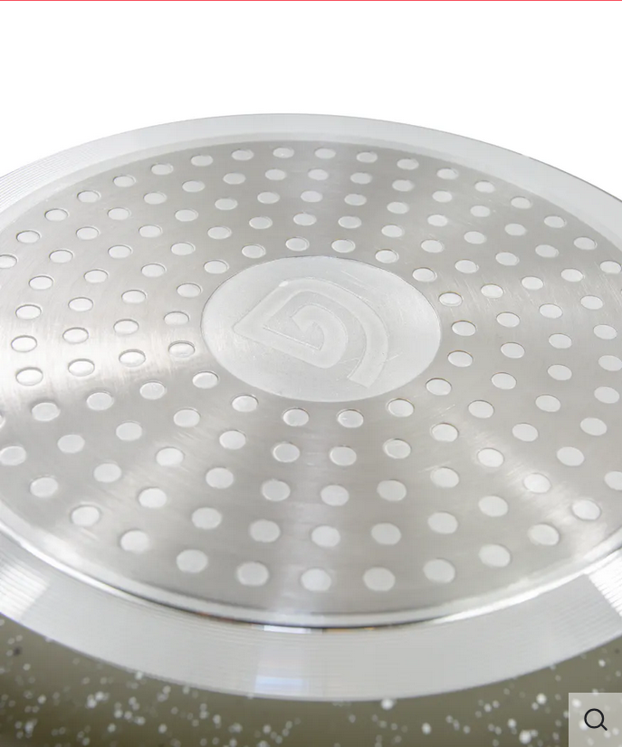 Każda patelnia ma grubą aluminiową konstrukcję 2,5 mm, z podstawką ze stali nierdzewnej z wytłoczonym logo Icon