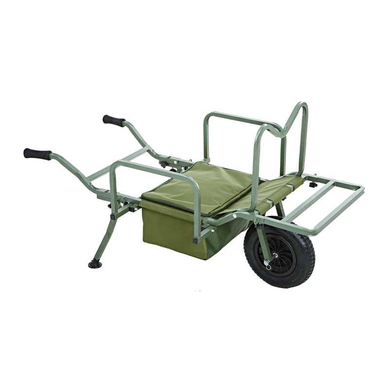 W głębokim, przestronnym worku ze zamkiem błyskawicznym można bezpiecznie przechowywać cały sprzęt, a osłona przeciwbłotna chroni przed rozpryskami z koła. Uchwyt wózka posiada ergonomiczne, miękkie nakładki zapewniające komfort, które łatwo składają się przy transporcie. Boczne listwy dodatkowo zabezpieczają przewożony sprzęt. Wózek wykonano z wytrzymałej stali i aluminium, a przednie, duże koło pneumatyczne ułatwia prowadzenie po nierównym terenie.