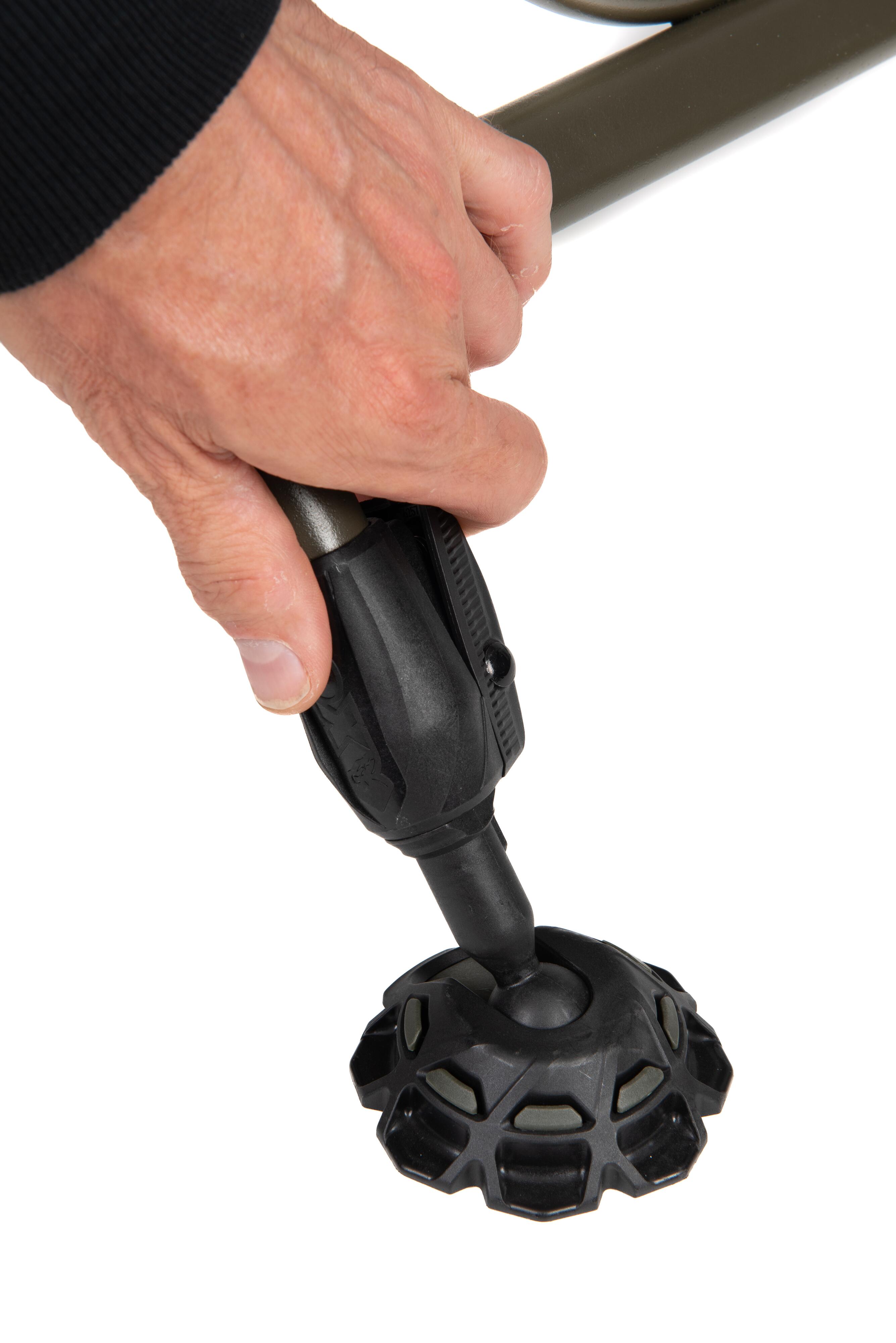 Zastosowany nowy mechanizm regulacji nóg typu one-touch z blokadą sprężynową pozwala na szybką i wygodną zmianę wysokości. Duże, obrotowe stopki typu mud feet gwarantują stabilność na każdym podłożu.