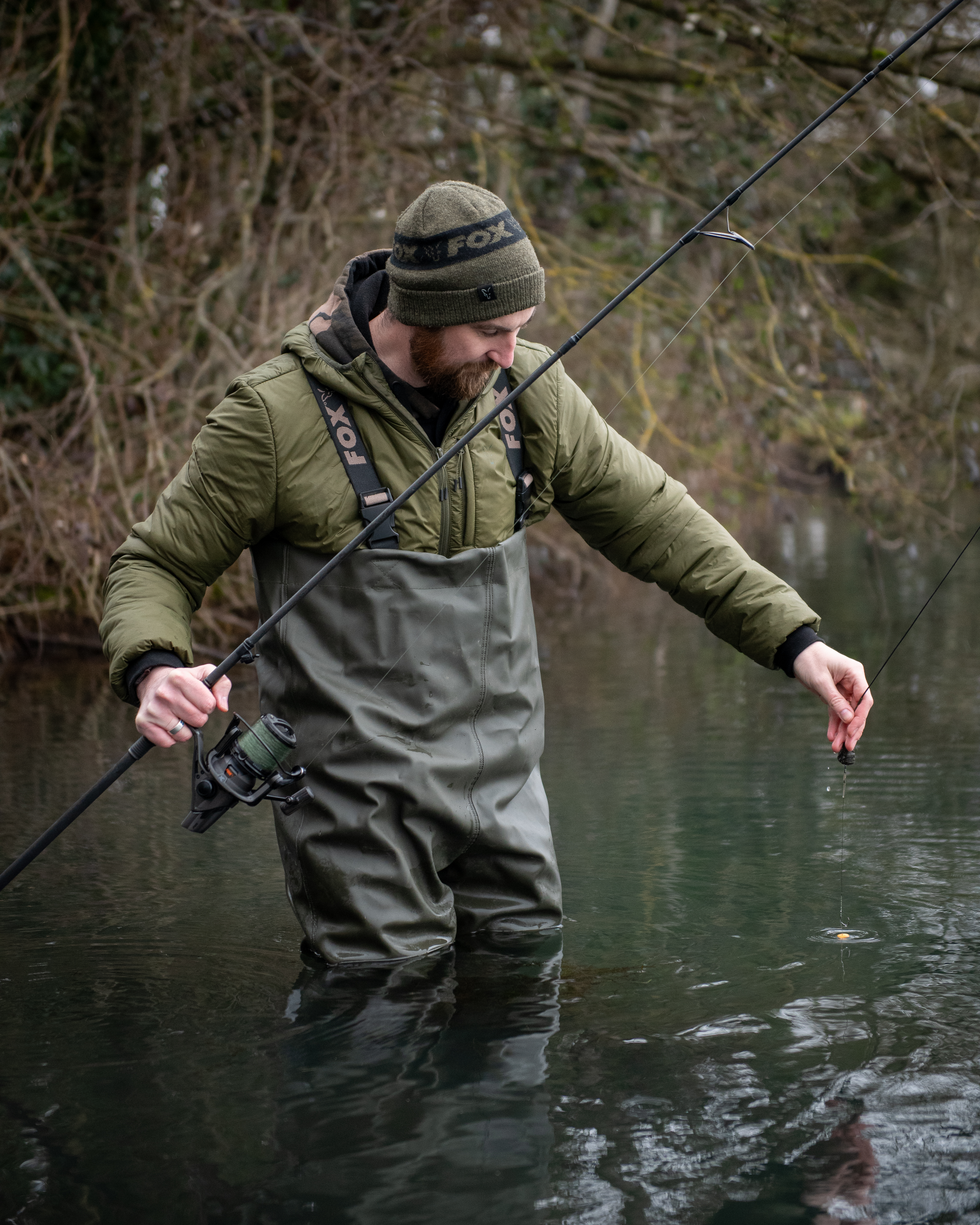 Wodery wyposażono w wewnętrzną kieszeń na piersi, idealną do przechowywania telefonu, dokumentów czy drobnych akcesoriów. Regulowane, elastyczne szelki z logo Fox gwarantują stabilne i wygodne dopasowanie do sylwetki.