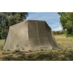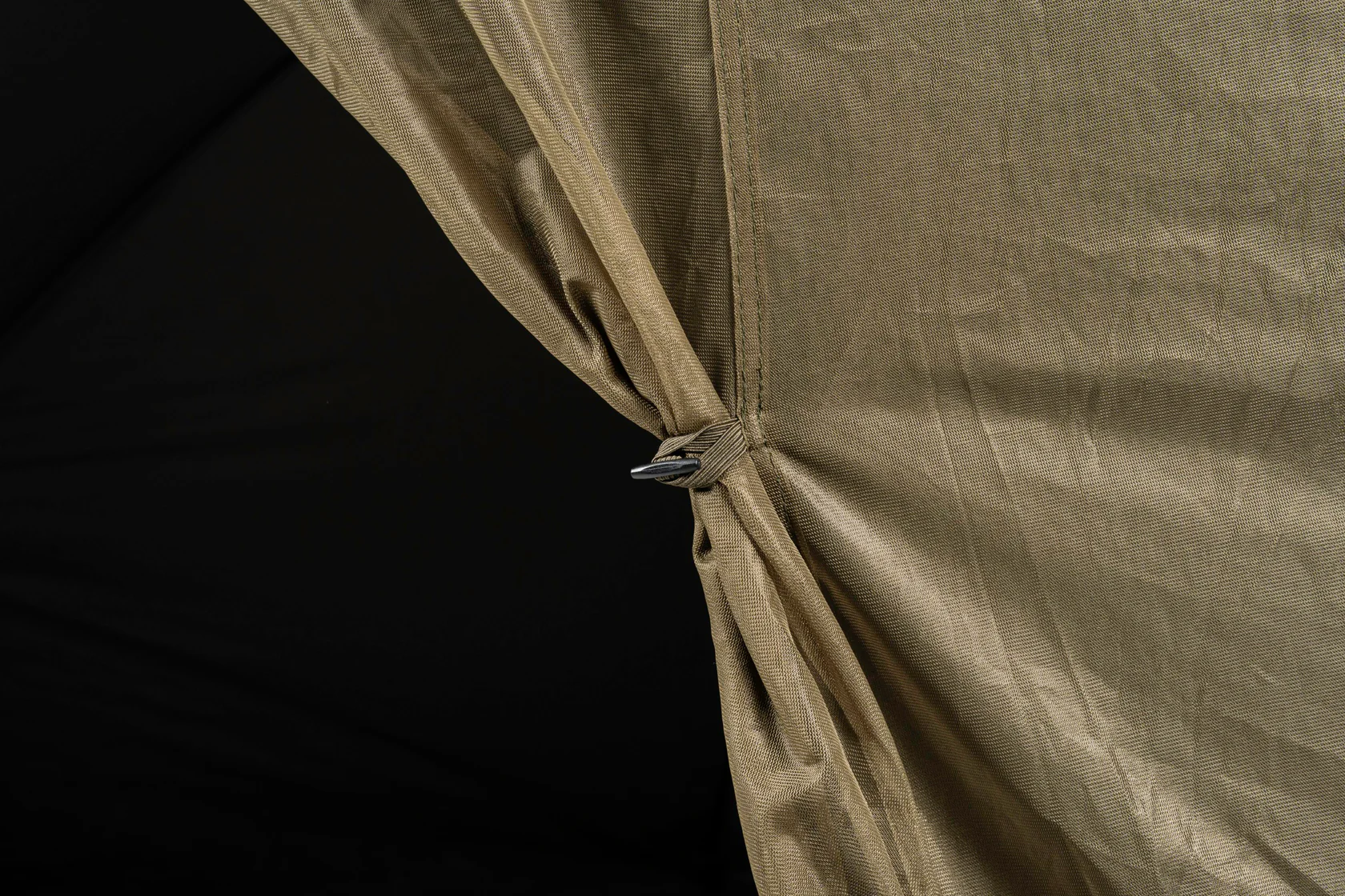 Wewnętrzny, wydłużony fartuch pozwala oprzeć nogi łóżka, dzięki czemu brolly stabilnie stoi na pomostach i betonowych powierzchniach, gdzie nie da się użyć śledzi.