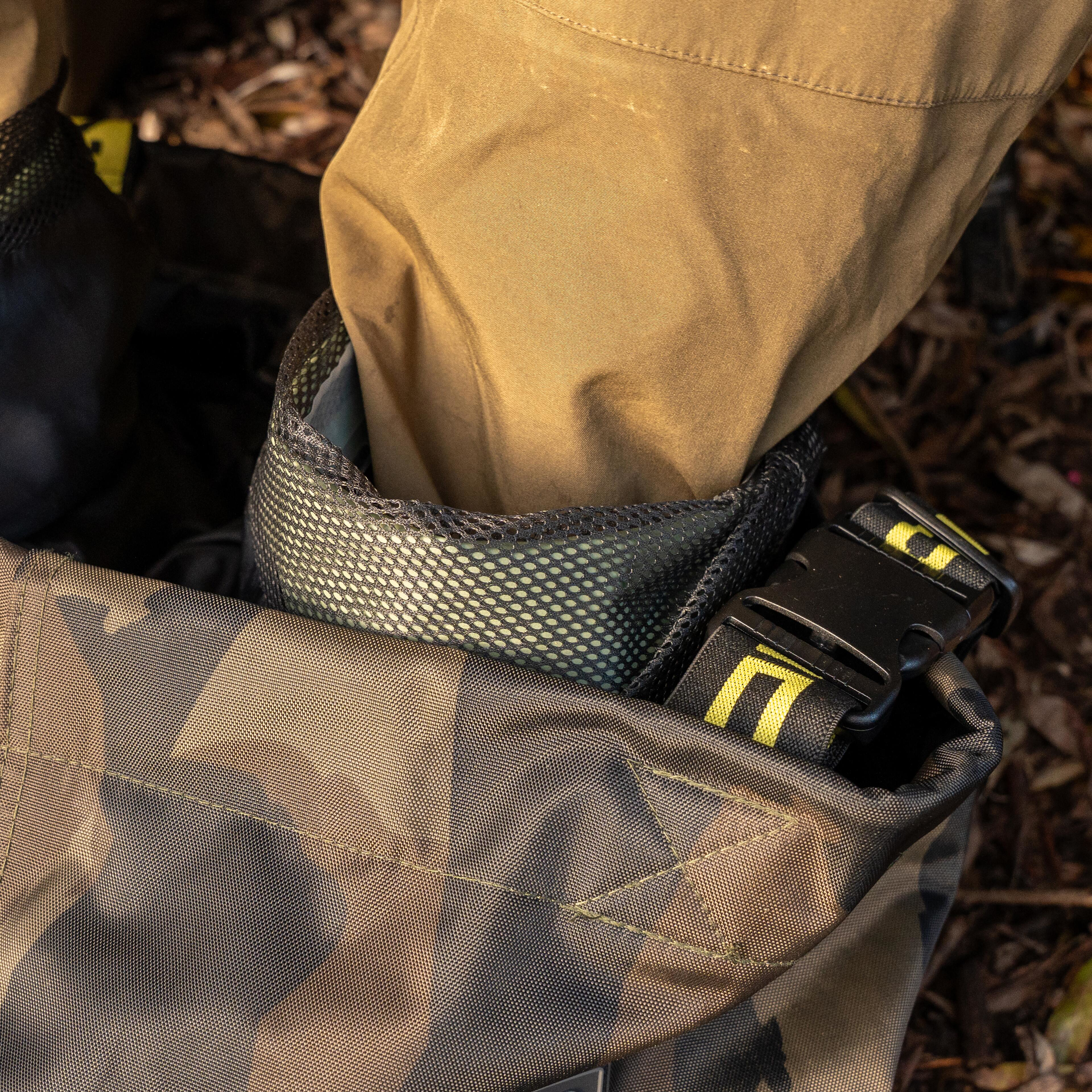 Wykonane z lekkiego, ale bardzo wytrzymałego materiału 420D Distortion Dark-Camo, z całkowicie klejonymi szwami zapewniającymi pełną ochronę przed wodą.