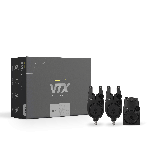 Zestaw sygnalizatorów brań VTX na 2 wędki – zawiera dwie głowice sygnalizatorów oraz odbiornik, w komplecie z twardymi etui typu clip-on, smyczą do odbiornika i śrubokrętem.