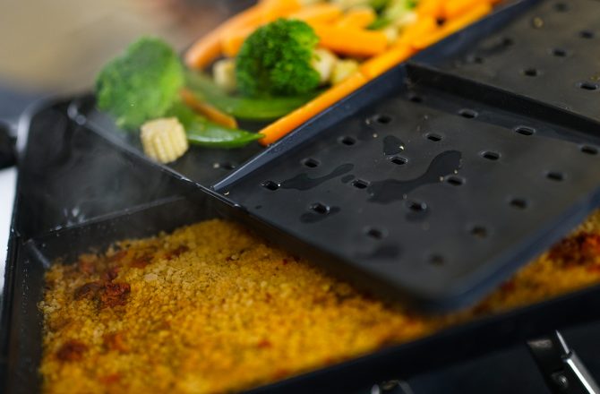 wrzuć tackę do gotowania na parze i delikatnie zagotuj wodę, używając drugiej strony Combi jako pokrywki – i voila,