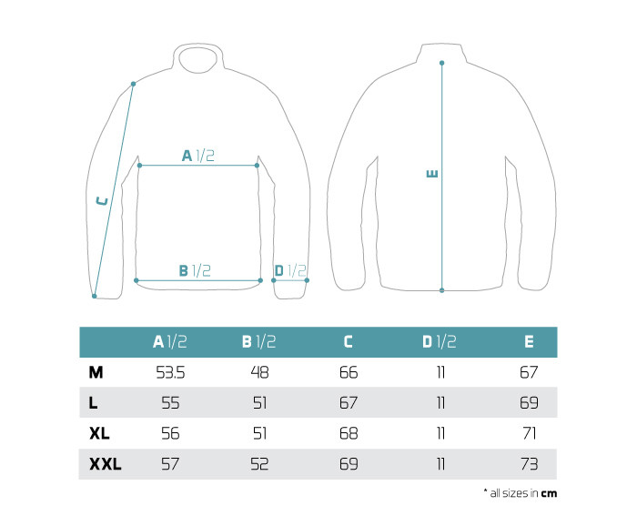 Pomiędzy zewnętrzną i wewnętrzną warstwą kurtki znajduje się wiatroodporna membrana o oddychalności 1000 g / m2 / 24h.